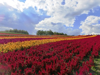 コスモスやクレオメ、ケイトウといった秋の花が綺麗なじゅうたんを造り、
