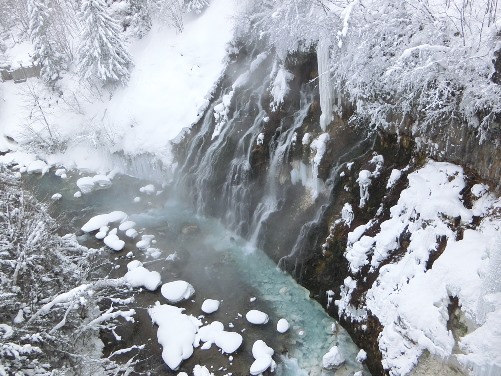 美瑛川のコバルトブルーは、さらに上流の白金温泉郷にある「白ひげの滝」で確認することができます。