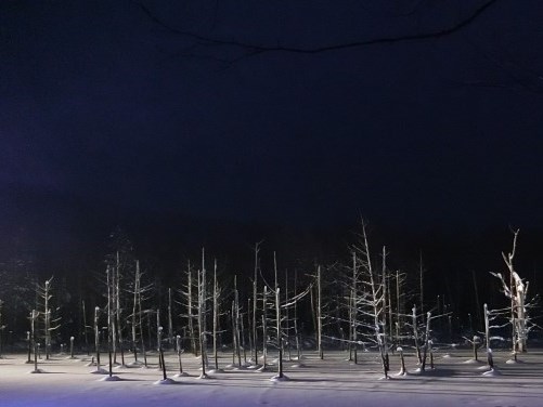 この冬は初めてライトアップが実施されており、白く凍り雪をかぶった水面が照らし出されています。