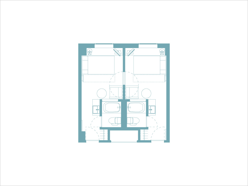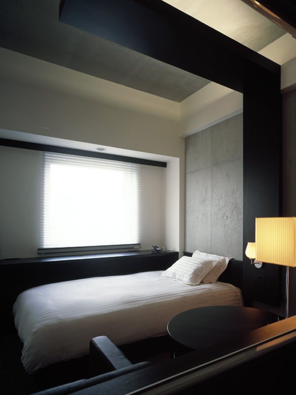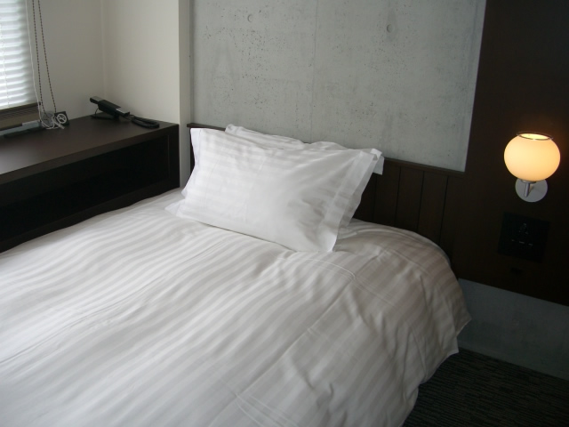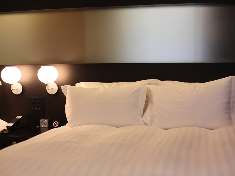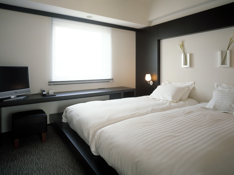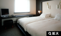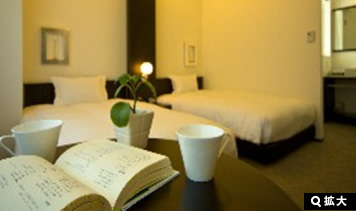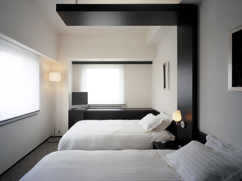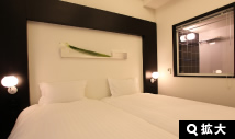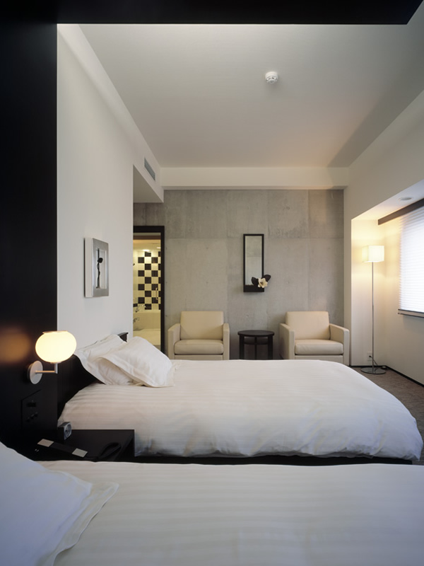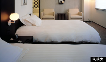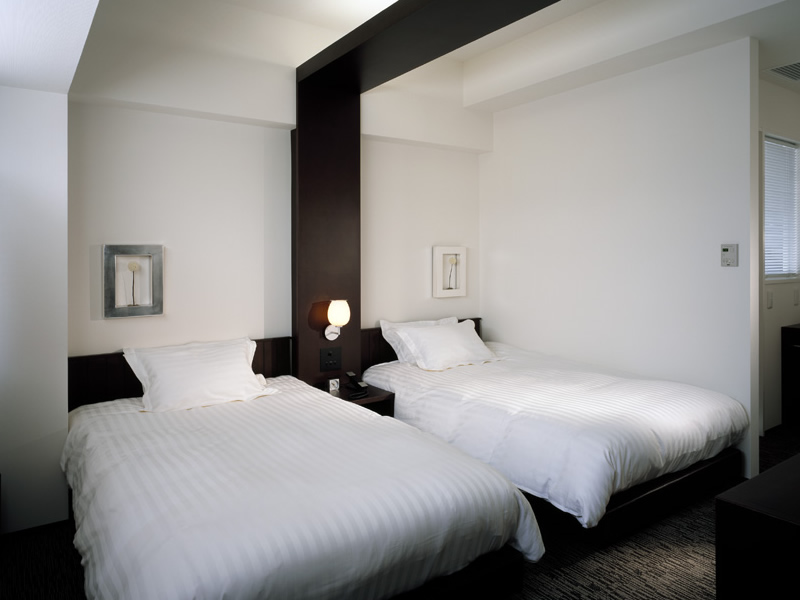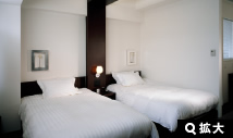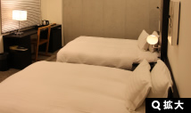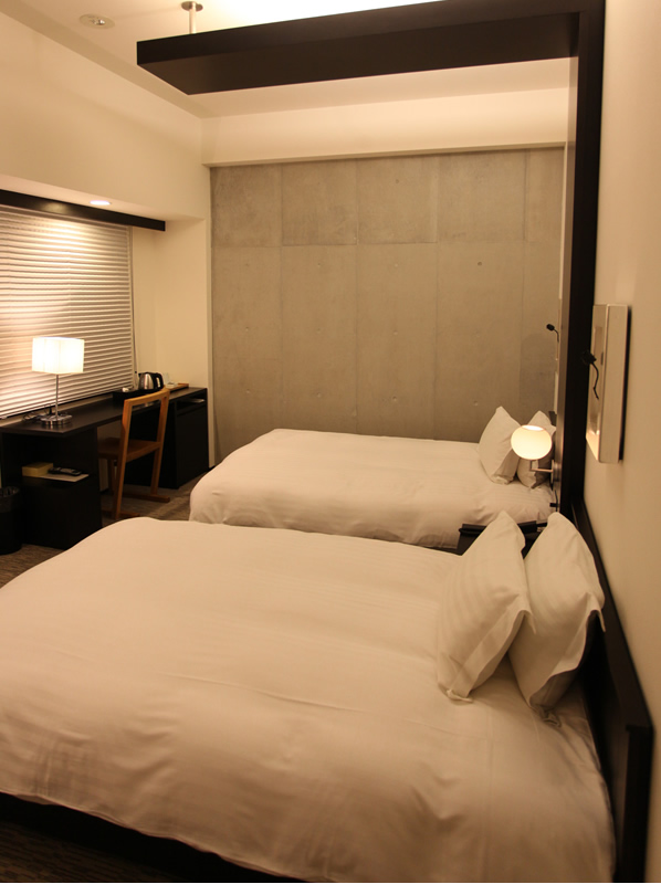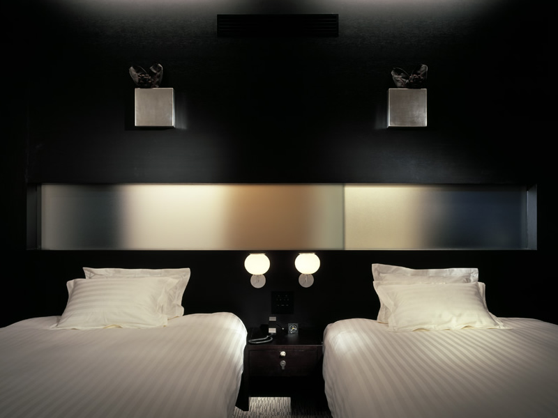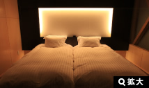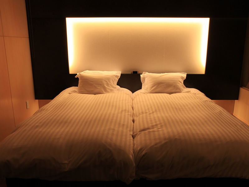 ゲート型に組まれたヘッドボードのデザインが、ツインルームでありながら、ダブルルームの親近感を演出しています。