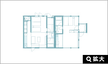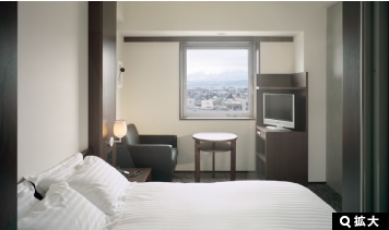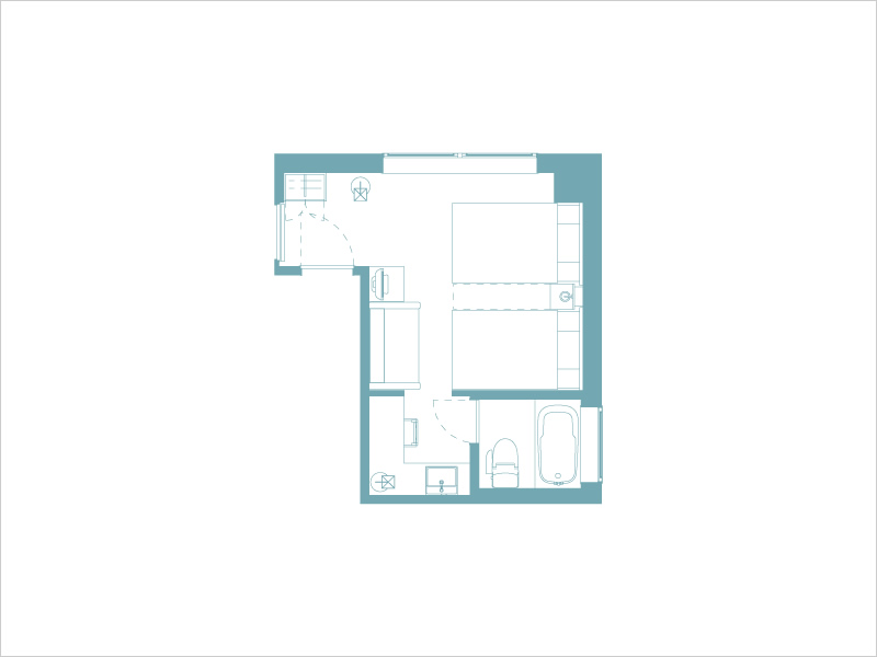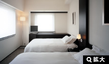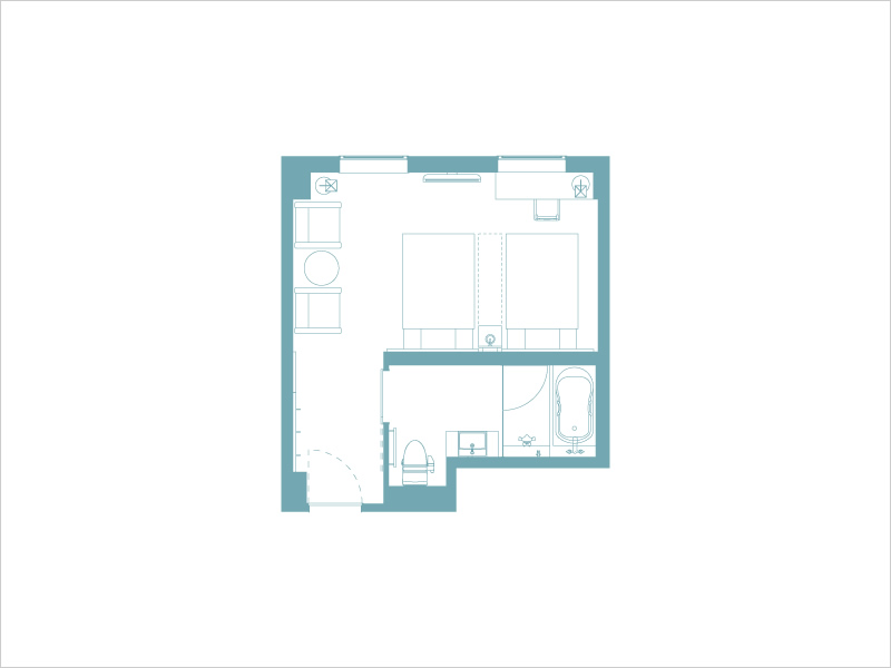 富良野市内を望めるタイプと十勝岳連峰を一望できるタイプのスタンダードツインルームがあります。洗面台はバスルームから独立していますので、ゆっくりと身だしなみを整えていただくことができます。(※平面図は、富良野市内を望めるタイプです。)